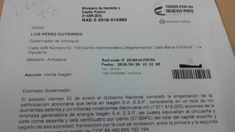 “Manifestamos de esta forma que el Gobierno Nacional está comprometido con que el 10% de los recursos provenientes de la enajenación de la participación de la Nación en ISAGEN S.A., ESP, esto es, $649.066.579.218, sean asignados y distribuidos a las entidades territoriales donde ISAGEN S.A., desarrolla su actividad principal, para lo cual sin embargo deberán primero ser incluidos en el Presupuesto General de la Nación, de forma que este Ministerio pueda distribuirlos conforme a lo establecido por el ordenamiento jurídico”, reveló el Ministro de Hacienda, Mauricio Cárdenas Santamaría, en una carta al gobernador Luis Pérez.