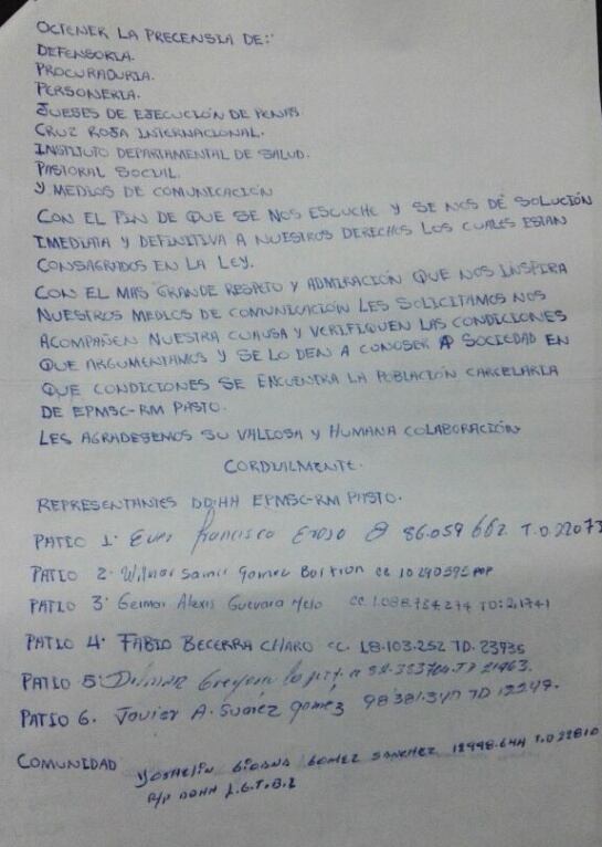 En huelga de hambre permanecen los internos de la cárcel judicial de Pasto quienes denuncian que son muy precarias las condiciones bajo las cuales permanecen en el penal. Muchos duermen en los pasillo ante el sobre cupo existente y las condiciones de salubridad también son bastante complicadas, se quejan además de la mala alimentación.