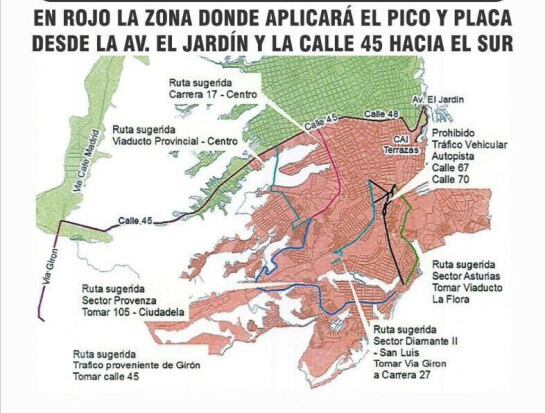En el siguiente gráfico se detallan las áreas de Bucaramanga cubiertas por el pico y placa y los sectores donde no habrá la restricción vehicular.
