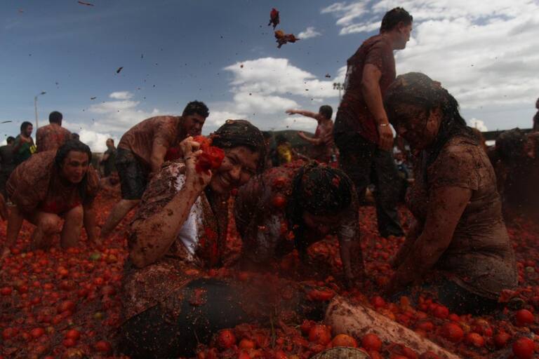 Treinta toneladas de tomate se convirtieron en el arsenal de una batalla que tiñó de rojo y sin sangre, las calles de la localidad en el departamento de Boyacá.