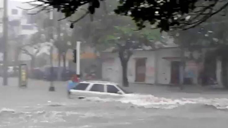 En el video se ve como un ocupante salta del carro, y con ayuda de otros intenta amarrar el vehiculo a un semáforo para hacer frente a la fuerza del agua.