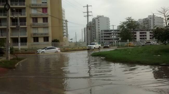 Las aguas lluvias se represan en la rotonda, al parecer por la obstrucción del desagüe, que dificultan el paso automotor en la Urbanización Villa Carolina al norte de Barranquilla.