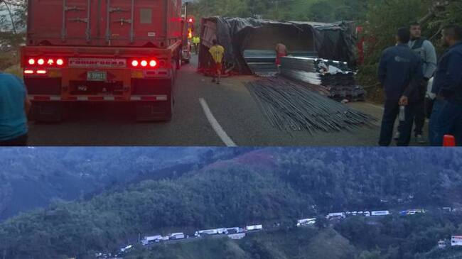 Dos curvas antes de llegar a Dosquebradas, bajando desde Santa Rosa de Cabal, se registró en la madrugada de este jueves el volcamiento de una tracto mula que llevaba varillas de acero como carga, por lo que se taponó a un carril la carretera, y debido al peso de la carga, no ha podido ser levantado el vehículo.