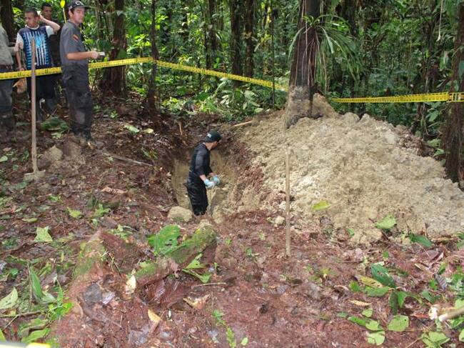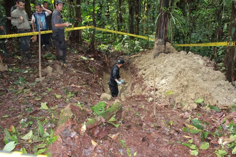 Personal de la Fiscalía con el apoyo de perros adelanta la búsqueda de restos humanos en la finca pero hasta el momento no se ha recuperado un solo cuerpo.