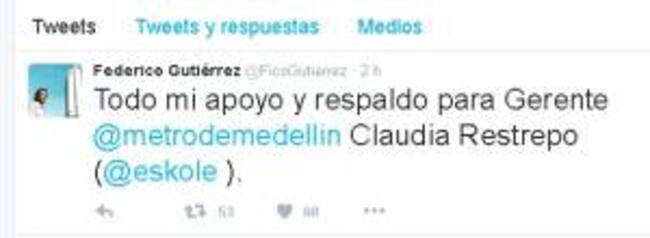 "Todo mi apoyo y respaldo para Gerente @metrodemedellin Claudia Restrepo (@eskole )", dijo el mandatario en su cuenta oficial de Twitter.