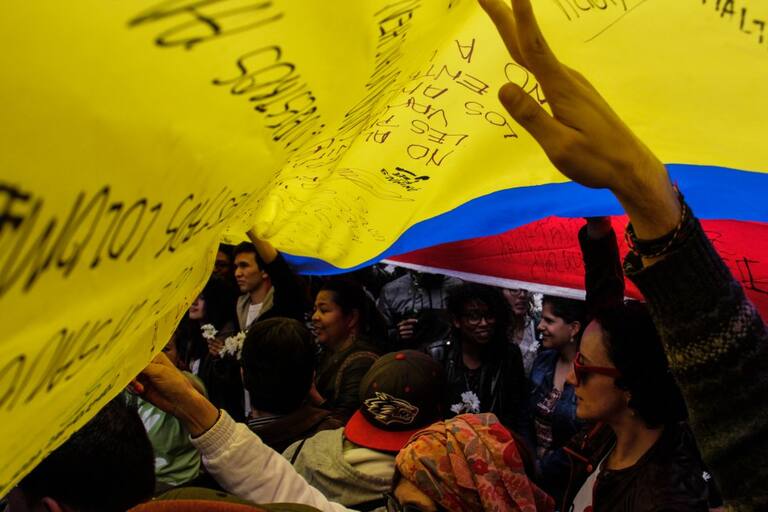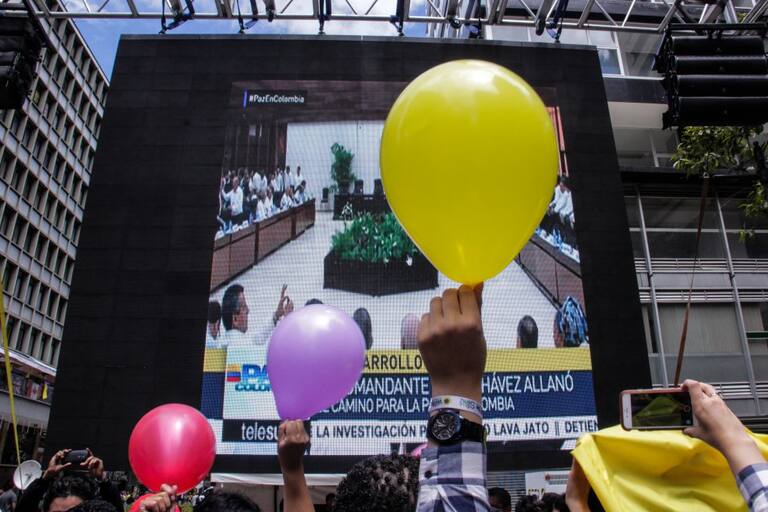 • Cientos de colombianos realizaron pancartas y portaron la bandera mientras observaban las pantallas que transmitían en vivo a los negociantes por la paz.
