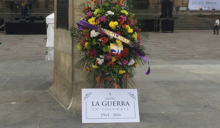 En el medio de la plaza llamó la atención de la ciudadanía una ofrenda floral que dice: QEPD LA GUERRA 1964 - 2016, allí las personas pasan y se toman fotos, también dejan sus opiniones.