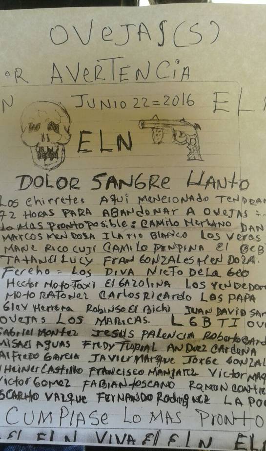 En el pasquín supuestamente de la guerrilla del Eln se amenazan a varias personas, que son acusadas de ser drogadictos y expendedores de drogas. Además de ellos a las directivas de la población Lgtbi en el municipio.