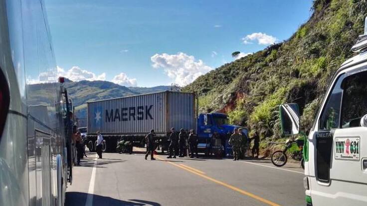 Dos personas pincharon varias tractomulas y obligaron a un conductor a esparcir su carga de arena sobre la vía.