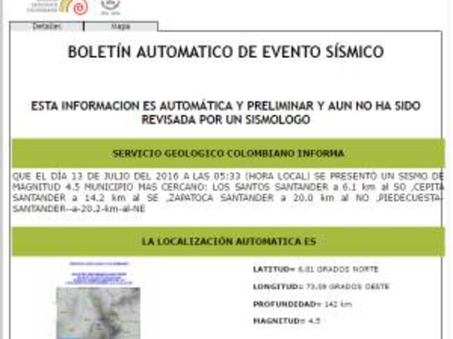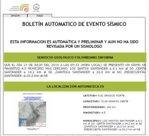 El evento tuvo una magnitud de 4.2 grados y como casi siempre ocurre, el epicentro fue el municipio de Los Santos a 39 kilómetros de Bucaramanga.
