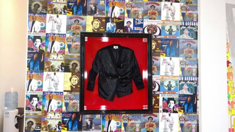 • Este mural con las caratulas de los LD y los CD que hacen parte de la vida musical de Joe arroyo, enmarcan una de las chaquetas usadas por el artista.