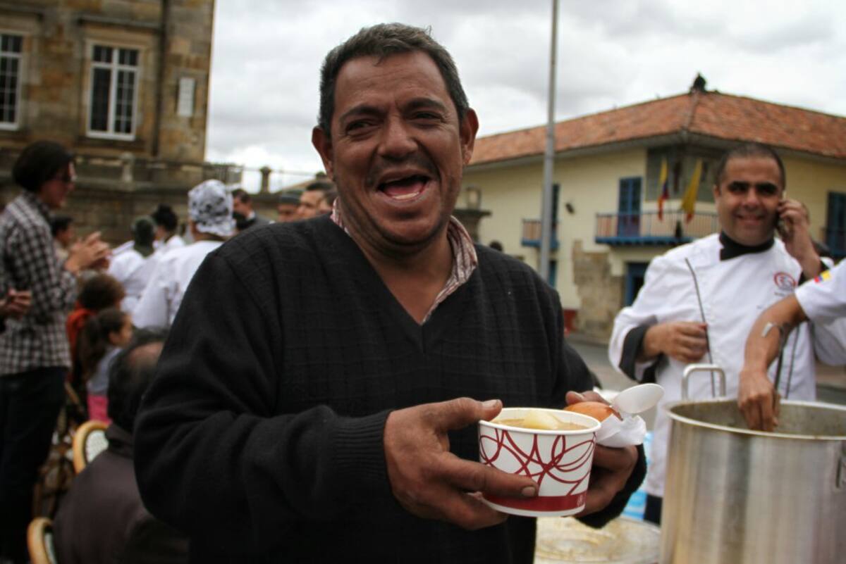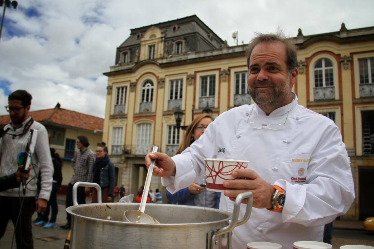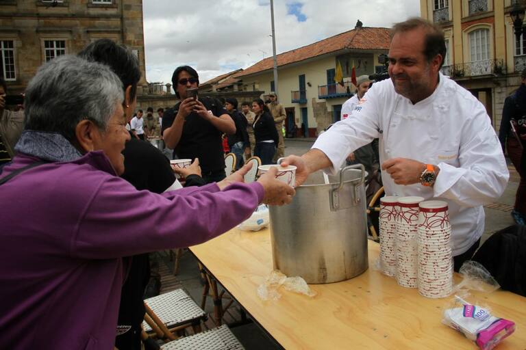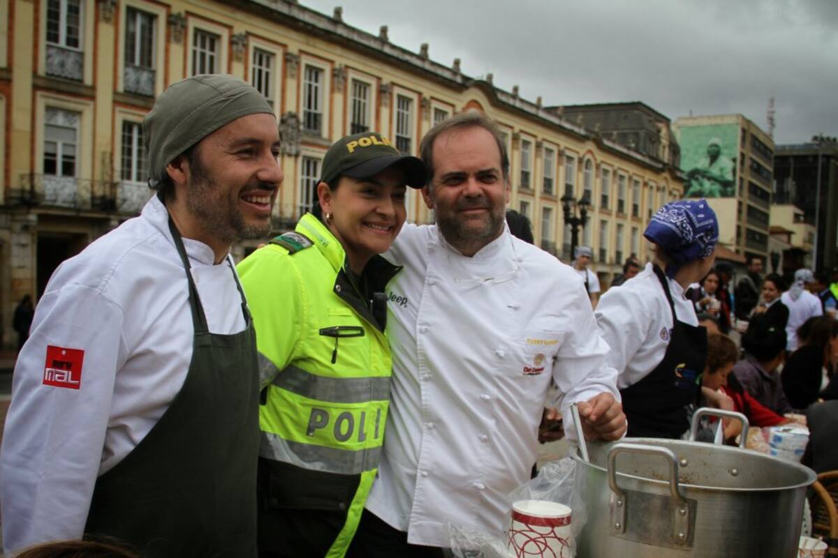 Cargados con ollas y en improvisados mesones, los cocineros, reunidos en la asociación Fogón Colombia y encabezados por los reconocidos chef Harry Sasson y Leonor Espinosa, deleitaron a los transeúntes bogotanos con un tradicional sancocho, con arroz atollado en Cali, y tamales en Cartagena.