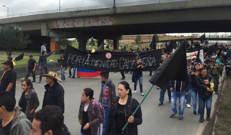 Con banderas y camisetas negras un grupo de alrededor de 1.000 personas avanza hacia el centro de Bogotá por la Calle 13 hacia el oriente, la movilización inició a las 10 de la mañana en el Playón de Fontibón y terminará en la Plaza de Bolívar.