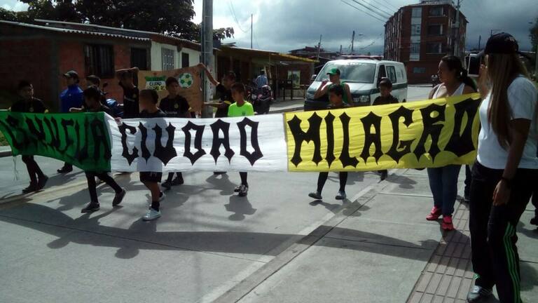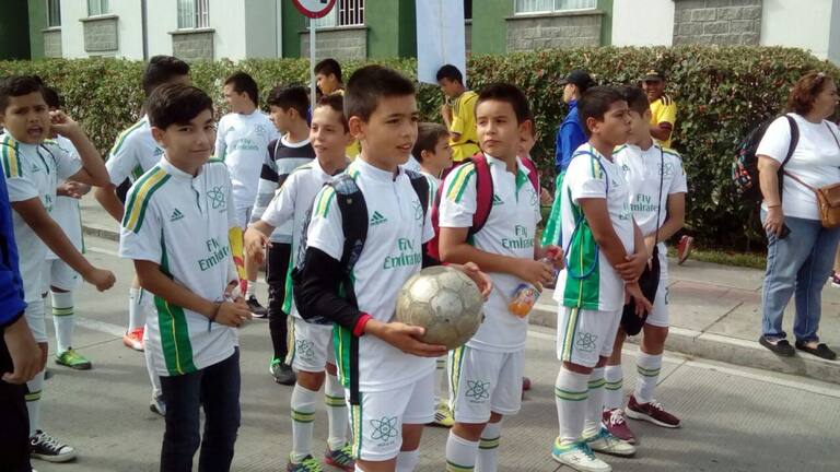 Los niños con uniformes y banderas buscan vivir el fútbol en paz
