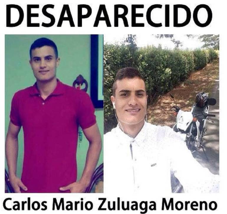 Carlos Mario Zuluaga Moreno, de 20 años, se encuentra desaparecido cuando regresaba de la ciudad de Armenia, Quindio, al municipio de Sevilla, Valle, en una motocicleta Honda 250 Tornado Blanca, con placa HQR62B.
