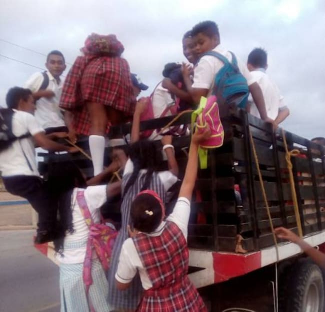 Colgados en camiones y hasta cuatro en una moto viajan a Maicao para recibir clases. Piden al gobernador (e) habilitar el bus donado por la presidencia.