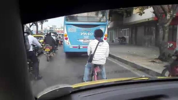 En vídeo: Hombre se amarró de un MÍO para ir más rápido en su bicicleta