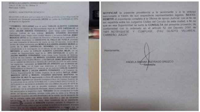 De acuerdo con el Oficio 2169 del 8 de agosto de 2016 del Juzgado Tercero Civil Municipal y en respuesta al incidente de desacato promovido por Mónica Alejandra Arango Muñoz, la medida incluye además al Gerente de Defensa Judicial, Julián Andrés Fernández; el auditor médico, Manuel Eduardo Bastidas Bastidas y a la Gerente de Cafesalud en Manizales, Dayla Jenny Mideros Ortiz.