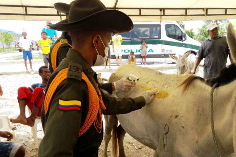 El Grupo de Carabineros y Guías Caninos de la Policía Metropolitana de Cartagena de Indias, adelantan unas campañas interinstitucionales, en conjunto con la Fundación Aldea y la Umata, la Primera de cinco jornadas de vacunación y salud para equinos programadas para intervenir y atender los caballos y asnos que son utilizados por sus dueños para distintas actividades.
