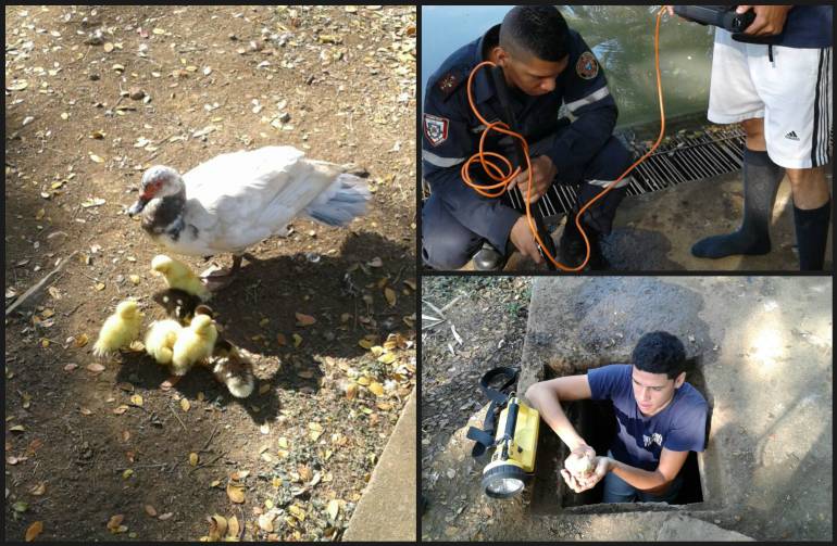 Con su mano y con la más silenciosa cautela para no asustar a los paticos, el bombero fue sacándolos uno por uno para regresarlos a las plumas de su madre, pero el último se complicó un poco por lo que les fue necesario usar un rastrillo para sacarlo.