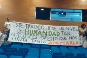 El senador llegó a la Universidad de Medellín luego de concluir una charla en la Universidad Eafit, donde un grupo de estudiantes le dedicó un cartel en el que decía: “Este tratado tiene un nivel de humanidad tan alto, que es por eso que nos cuesta tanto aceptarlo”, Uribe Vélez pidió allí respeto.