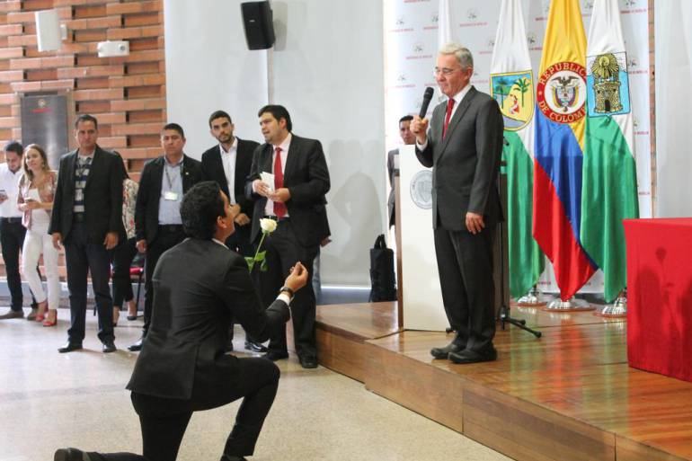 En una calurosa conferencia en la Universidad de Medellín, un grupo de estudiantes, le entregó una rosa blanca y un anillo de compromiso al senador del Centro Democrático, Álvaro Uribe Vélez, como símbolo de motivación para que le diera el sí a la paz.