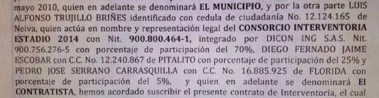 El consorcio Interventoría Estadio 2014 tiene dos socios: Dicon Ing S.A.S (coincidencialmente familiares de Luis Alfonso Trujillo Briñez) y los ingenieros Diego Fernando Jaime Escobar y Pedro José Serrano Carrasquilla.
