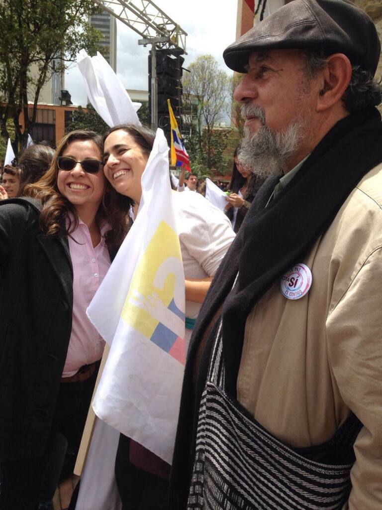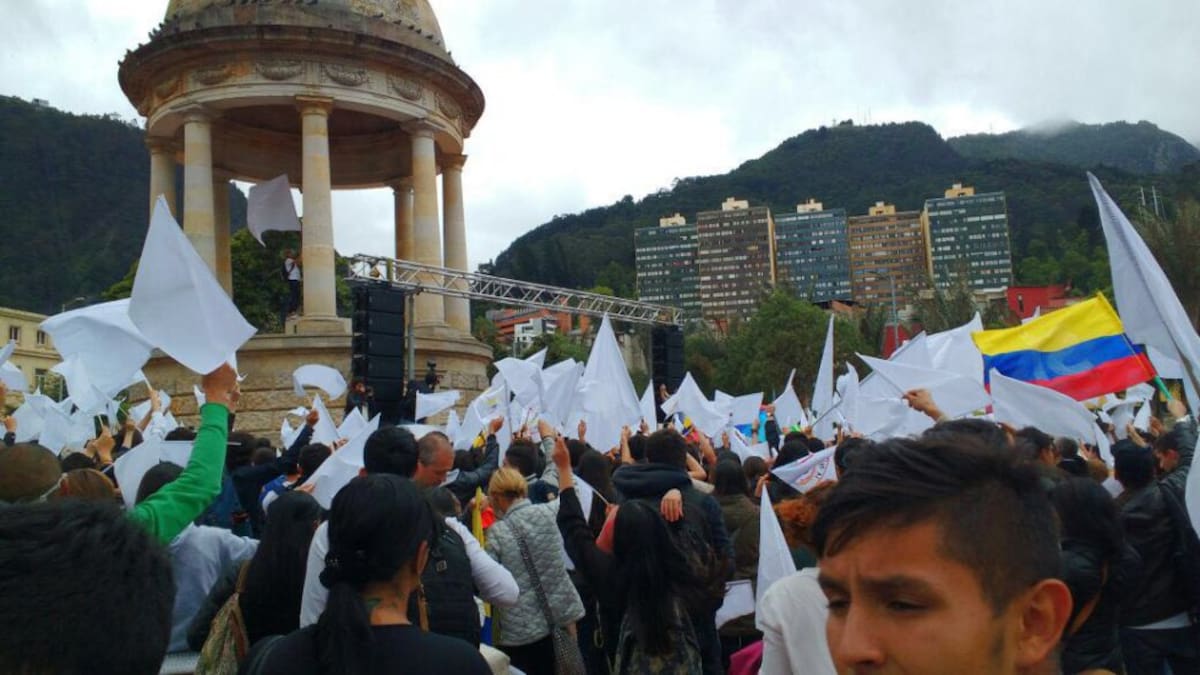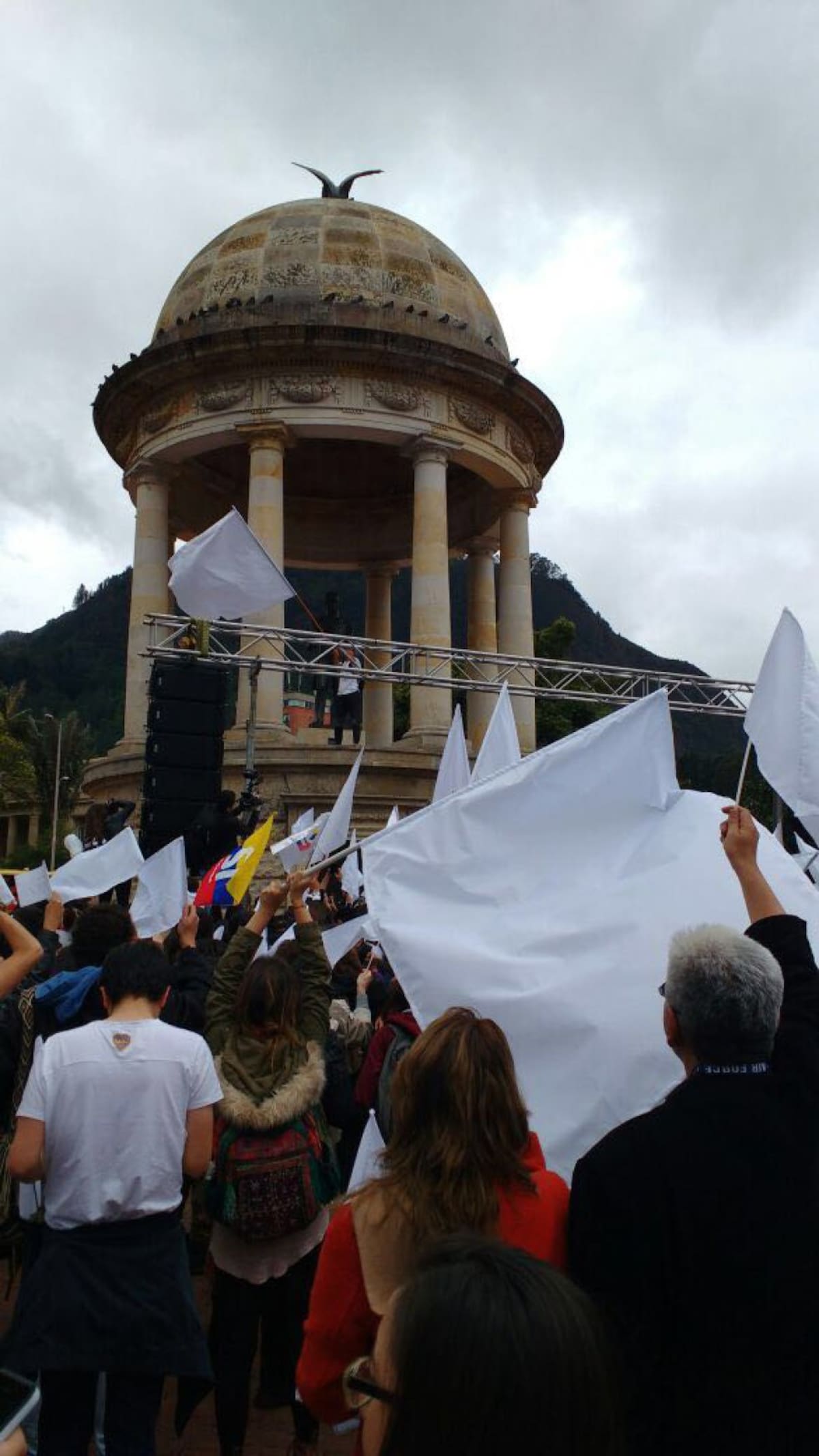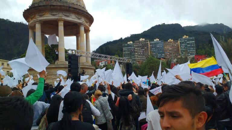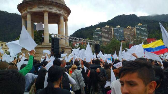 Con camisetas blancas y banderas de Colombia bogotanos salieron a las calles para apoyar el Sí al plebiscito, y se dieron cita en el Parque de los Periodistas.