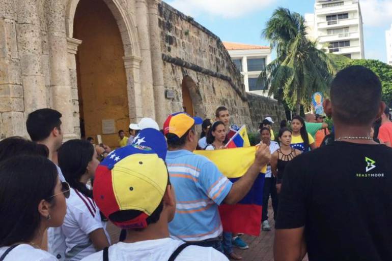 Con banderas, camisetas y pancartas varios venezolanos residentes en Cartagena se concentraron en la Plaza de La Paz para apoyar desde la distancia el referendo revocatorio contra el presidente de Venezuela Nicolás Maduro.