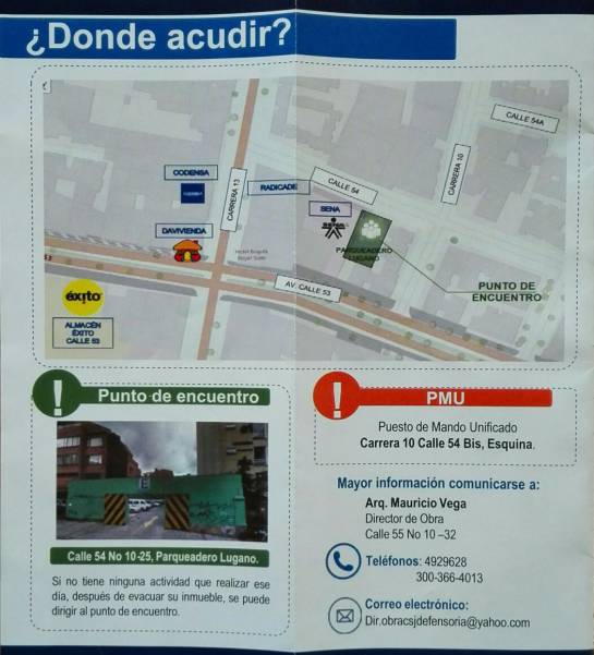 A partir de las 7:00 de la mañana comenzarán a realizarse las labores de perifoneo y evacuación de las personas residentes dentro del perímetro de seguridad, y hacia las 10:00 de la mañana será instalado el Puesto de Mando Unificado (PMU) en la Calle 54 Bis con Carrera Décima , desde el cual se realizarán todas las coordinaciones. A esa misma hora, serán suspendidos los servicios de energía y gas como medida de prevención, tema que estará a cargo de las empresas Codensa y Gas Natural, respectivamente, señala el comunicado.