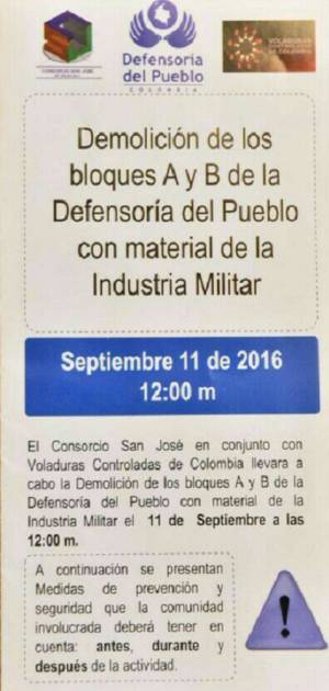 Para las 12 del día del próximo domingo 11 de septiembre está prevista la demolición de dos torres de la antigua sede de la Defensoría del Pueblo en Bogotá.