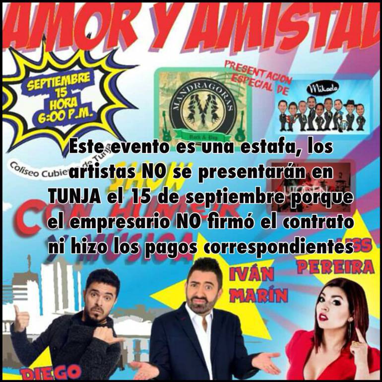 Los comediantes se mostraron sorprendidos ante una publicidad falsa que pretendía vender boletas en Tunja, para un show de amor y amistad que supuestamente se presentaría el 15 de septiembre en la capital del departamento, a la 6pm en el coliseo cubierto de Tunja.