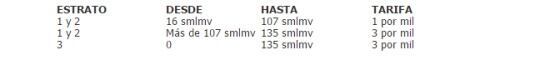 Los estratos 1 y 2 que tengan entre 16 y 107 salarios mínimos legales vigentes tendrán una tarifa de uno por mil; estratos 1 y 2 que tengan salarios mínimos legales superiores a 107 y hasta los 135, tendrán una tarifa del tres por mil, por último, el estrato tres que tenga salarios mínimos superiores a 135 tendrán un tarifa del tres por mil.