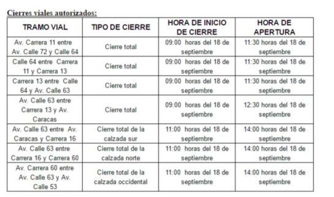 Según las secretaria de Movilidad, habrán algunos cierren viales en la cuidad, el primero de ellos es en la Calle 64 entre Carrera 11 y Carrera 13 y Carrera 13 entre Calle 64 y Av. Calle 63, el cierre total de estas vías es a partir de las nueve de la mañana hasta las 11 y media del día.