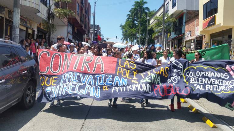 En paro llevan más de 15 días aprendices, formadores y funcionarios del Sena, los manifestantes que hoy recorren las principales calles de la ciudad, aseguran que no van a levantar el paro hasta que el Gobierno Nacional les cumpla.