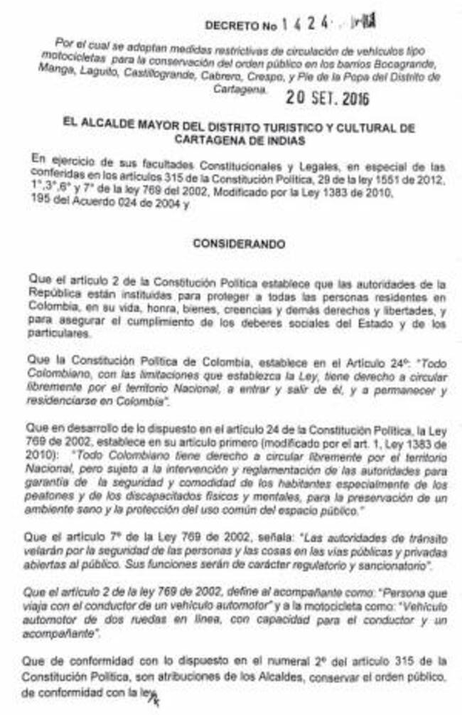 Mediante decreto No. 1424 del 20 de septiembre de 2016 se adoptan medidas restrictivas de circulación de vehículos tipo motocicletas para la conservación del orden público en los barrios Bocagrande, Manga, Laguito, Castillogrande, Cabrero, Crespo y Pie de la Popa.