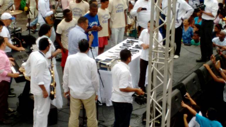 Más de 60 Jóvenes en riesgo ex integrantes de diferentes pandillas tales como ‘Los cultura’, ‘Los magníficos’ y ‘Los de la 17’ en Cartagena entregaron sus armas a cambio de biblias, el acto tuvo lugar en la Plaza de la Aduana donde millares de personas agradecieron a Dios por la obra que está haciendo con estos jóvenes donde muchos de ellos son menores de edad.