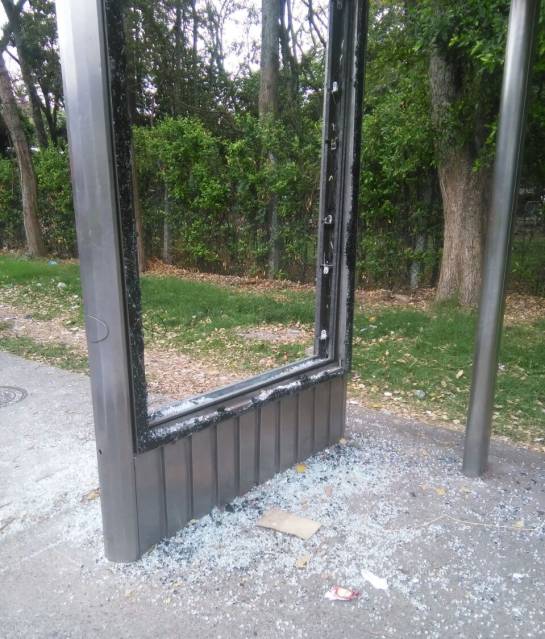 Monumentos, canecas de basura y paraderos de buses permanente son dañados por la acción de graffitis o les son lanzados objetos contundentes para quebrar sus vidrios.
