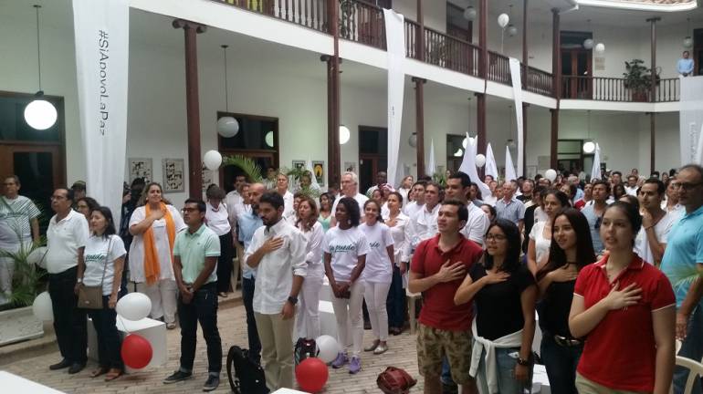 Varios caleños, reunidos en la Casa Proartes, en donde se acondicionó una pantalla para observar lo que sucedía en Cartagena, al momento de la firma de los acuerdos a cargo del líder de las Farc, Rodrigo Londoño, alias "Timochenko" y el Presidente Juan Manuel Santos, se escucharon vivas a Colombia, aplausos y cánticos de "si se puede" y "no más guerra".