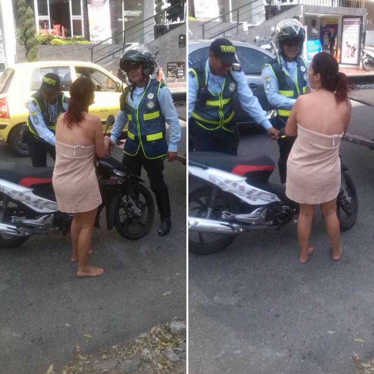 Tratando de impedir el operativo, la mujer que tomaba un baño salió en toalla y rogó que no se llevaran la motocicleta.