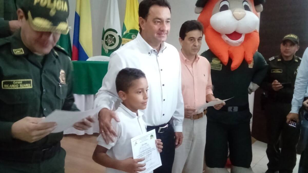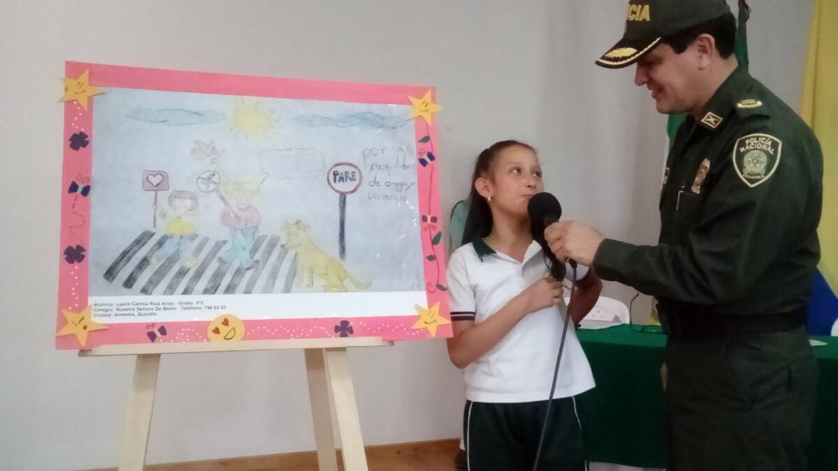 Niña ganadora del concurso de dibujo sobre prevención de droga habla con comandante de la policía, Quindío