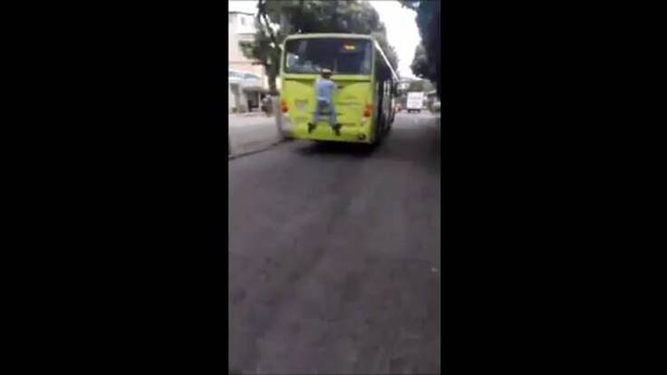 En las imágenes se ve como el hombre viaja colgado a la parte trasera del bus del sistema.