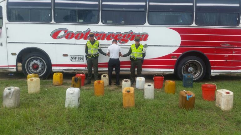 Unidades del Grupo Operativo de Policía Fiscal y Aduanera (POLFA), inmovilizaron un bus con pasajeros donde se transportaba combustible de contrabando y capturaron a una persona en una de las entradas a Valledupar.