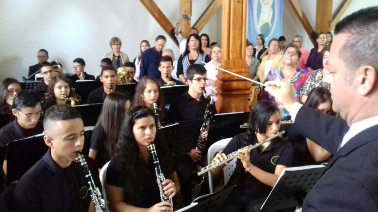 Maestro Juan José Ramírez y la banda sinfónica juvenil de Armenia interpretando los himnos