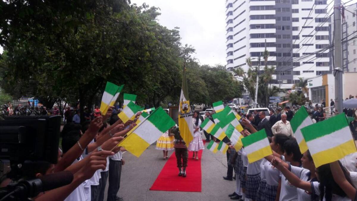 Estudiantes del colegio Jesús María Ocampo con banderas de Armenia avivan el paso de los restos del fundador de la ciudad