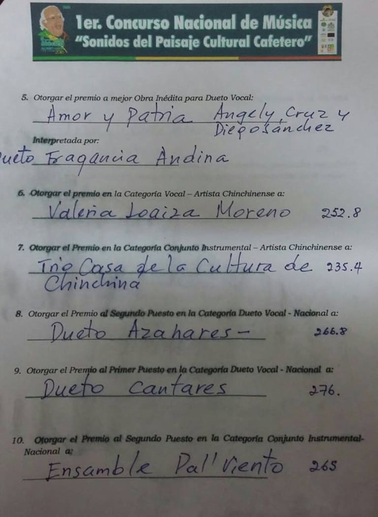 Cuadro de honor de los ganadores en Chinchiná, Caldas
