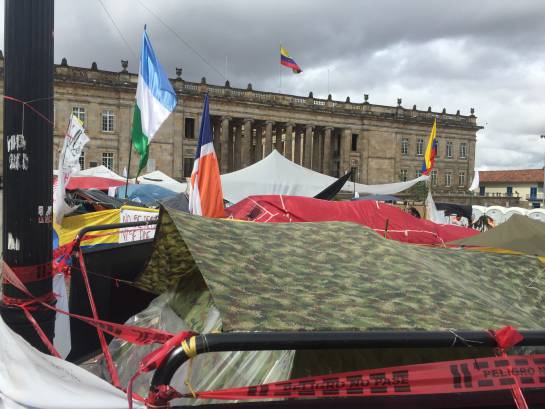 "Este campamento seguirá hasta que se concreten los acuerdos logrados en La Habana", dicen al unísono los ahora habitantes de la Plaza de Bolívar de Bogotá.