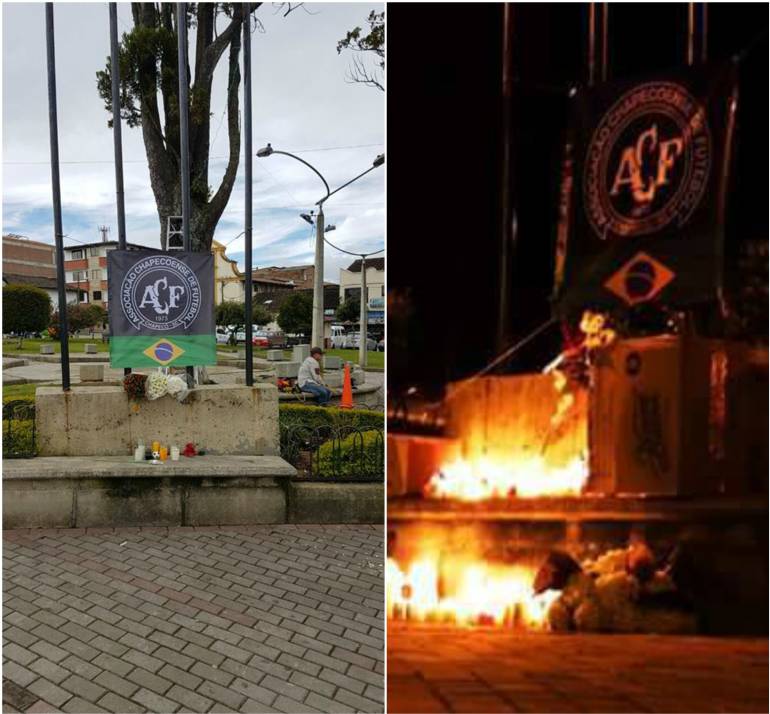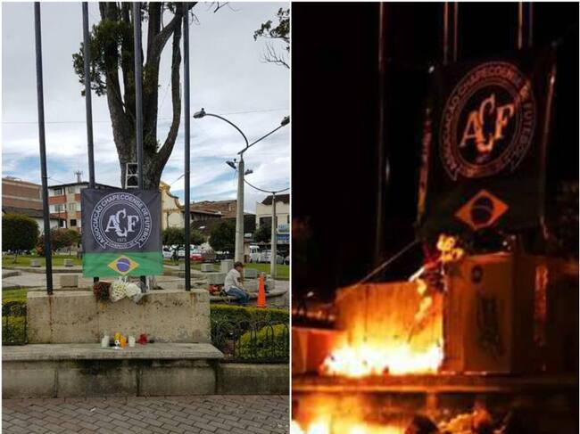 En el parque principal también instalaron una bandera del equipo brasileño, acompañada de la bandera de Brasil, ornada con flores y velas que fueron encendidas en honor a los fallecidos.