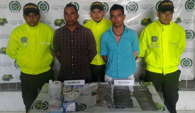 Los detenidos, Carlos Alberto Canedo Ospino, de 45 años de edad, y Osnaider de Jesús Escobar Ospina, 24 años, tenían en su poder 296 papeles en proceso de falsificación de moneda nacional en denominación de billetes de $50.000 y químicos utilizados para el mismo fin.