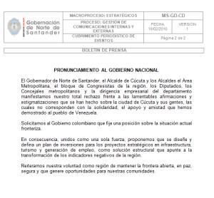 El Alcalde de Cúcuta indicó "Los cucuteños somos personas de bien, trabajadoras y que a pesar de la crisis hemos logrado salir adelante con el apoyo de los empresarios y por lo tanto necesitamos respeto”.